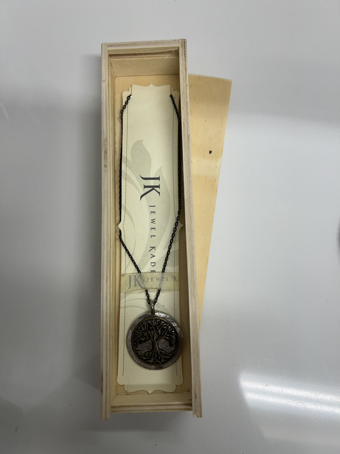 Jewel Kade still in box family tree or tree of life necklace.