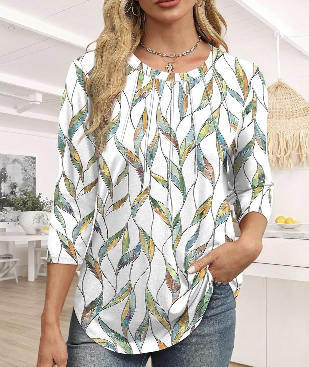 3/4 Length Sleeve Womens Tops Casual Tunic Tops Round Neck Basic Pleated Shirts Loose Fit 2025 Brand New Medium Size