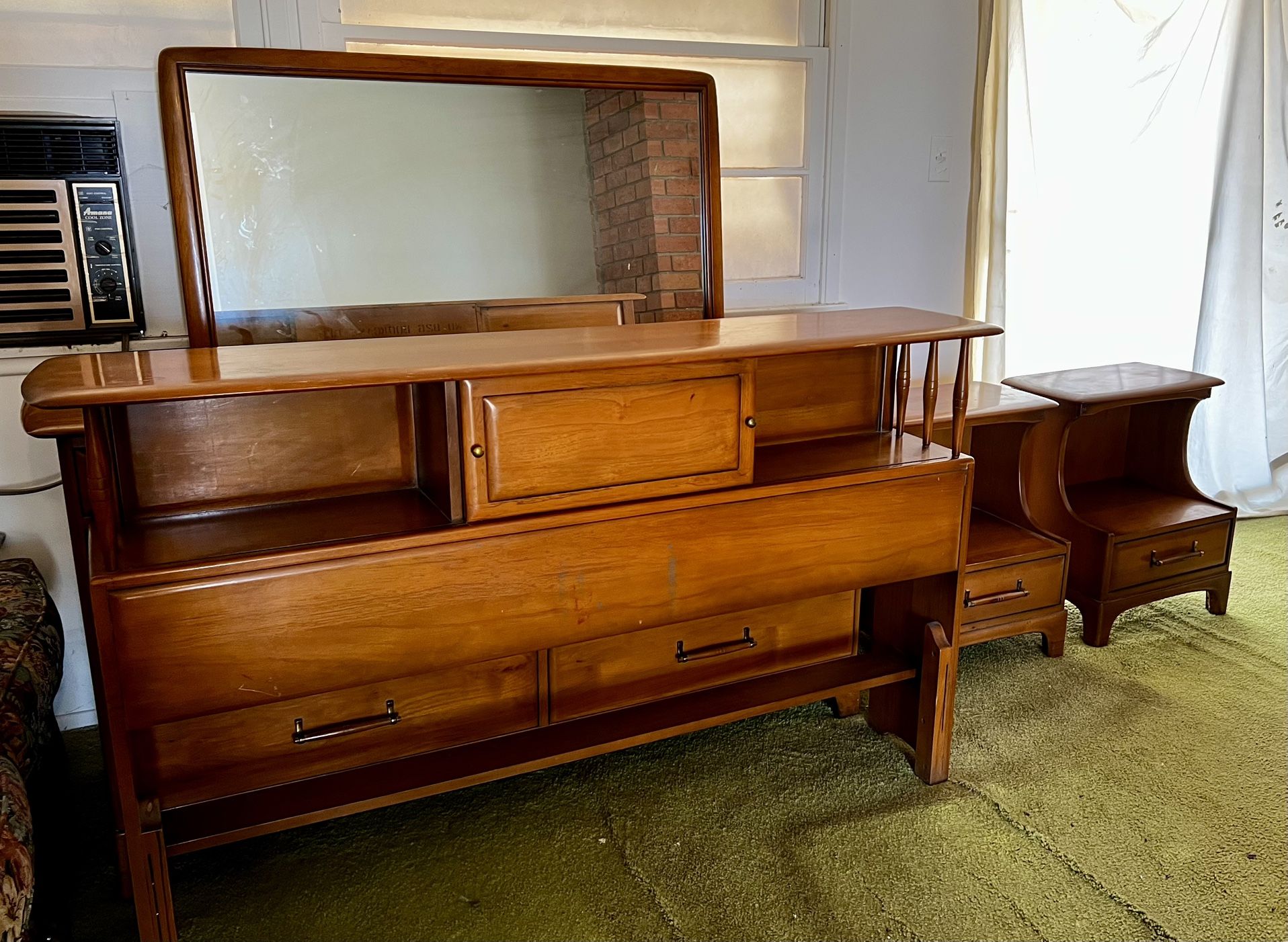This is a beautiful mid-century pecan wood bedroom set crafted by Unique Furniture Makers which includes a queen headboard, three bed slats for mattress support, triple 11 drawer-dresser with large mirror, and two nightstands. This furniture set was carefully crafted by skilled carpenters in the early part of the mid-century era and comparable to Henredon, Widdicombe and other high quality furniture makers from that time period. These pieces are made from solid pecan wood, and the drawer pulls are also made from solid pecan wood. The drawers all have dovetail joints and wooden drawer rails and there are dust catcher board underneath every drawer – something you just don’t see anymore. Approximate Measurements: Dresser: No 824 Triple Dresser / Pecan Width: 62” Depth: 20” Height: 36” Height with mirror: 66” Dresser Mirror: Width: 47” Height: 33” Headboard: No 826 4/6 Bookcase Bed / Pecan Width: 61” Depth: 12” Height: 37” Nightstands: No 807-A Nite Stand / Pecan Width: 22.5” Depth: 16” Height: 25” There is wear to the finish on the top of the headboard and on one of the nightstands (faded where a lamp was placed for years) and normal wear on the other pieces. The last 3 pictures provide an idea of what the set looks with some TLC. Unique Furniture Makers was a quality furniture company established in Winston-Salem, North Carolina in 1854 and had a long history in furniture production. Initially, the company was named J.C. Spach Wagon Works, Inc. and later transitioned into furniture manufacturing. The company closed down due to tornado damage. This set is sold as-is and returns are not accepted. It is located in Granada Hills, CA in the San Fernando Valley. Please be prepared to pick up and take away. Cash or money order only please. No checks. Thanks for looking.