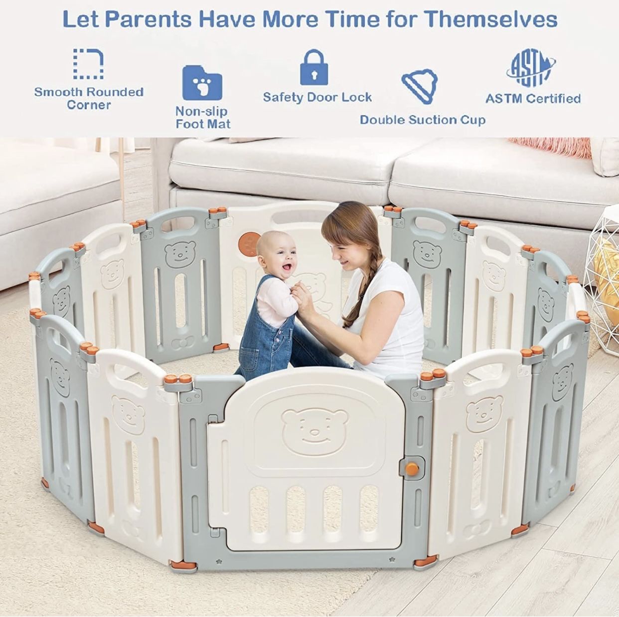BRAND NEW: Costzon Baby Playpen, 14-Panel Foldable Large Baby Playard w/Locking Gate, Non-Slip Rubber Bases, Adjustable Shape, Portable Baby Fence Play Area Design for Indoor Outdoor Use (Beige + Gray) Was $130.00 before tax + shipping Price $100.00