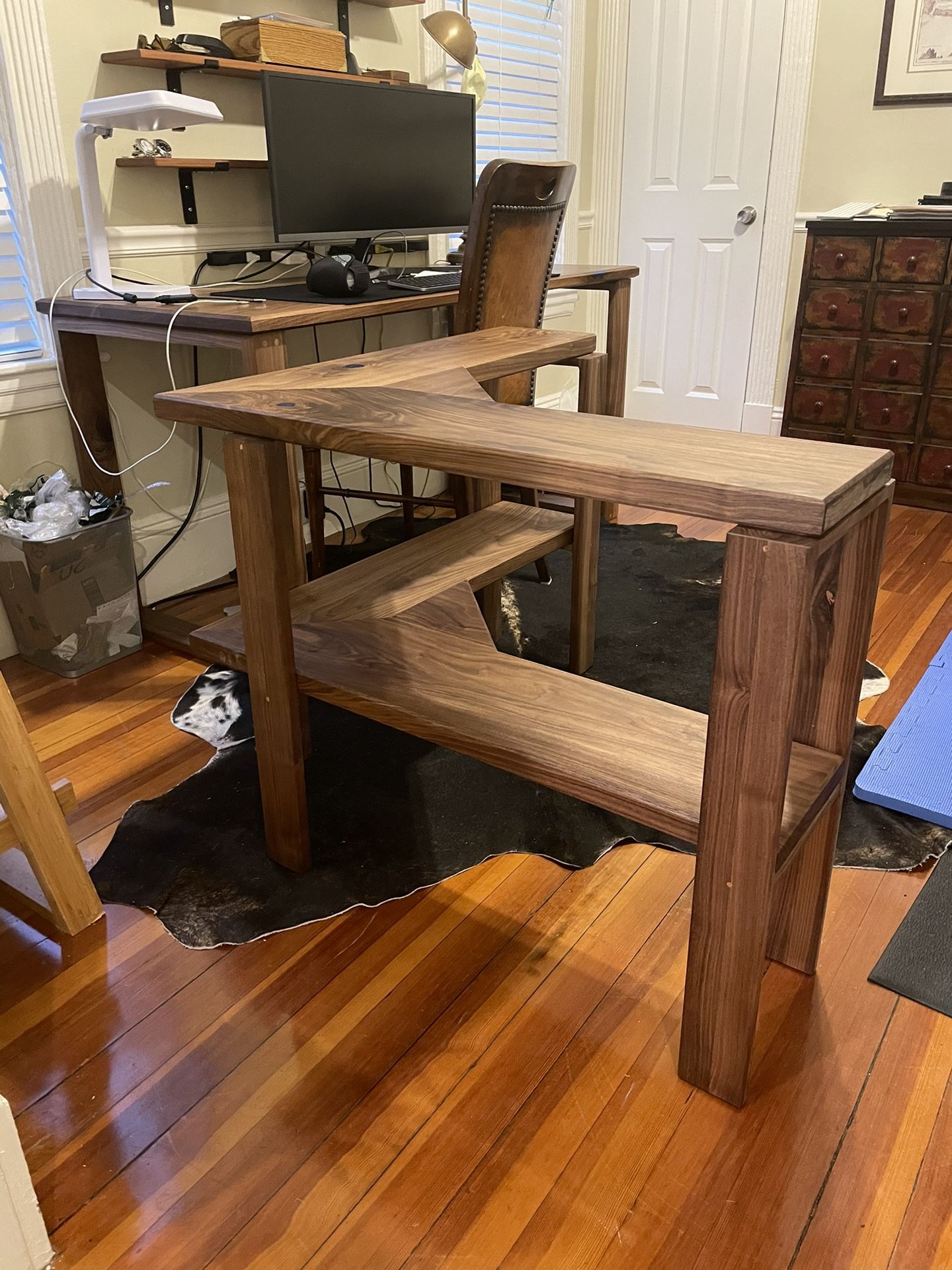 Solid black walnut corner table with custom legs. Dimensions available upon request