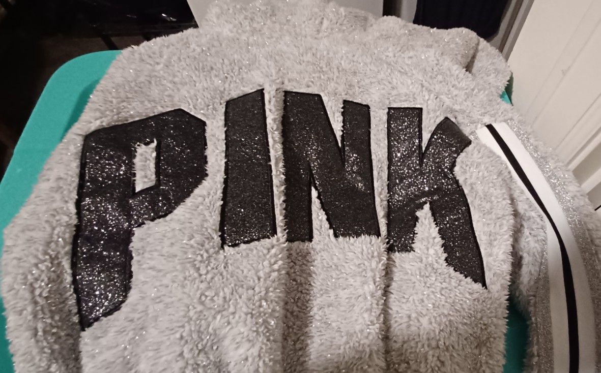 New Victoria Secret Pink Bathrobe Women's size extra small gray with black letters Super cute with hood. $25 firm Perfect for Valentines Day gift π Fits women's size extra small and small