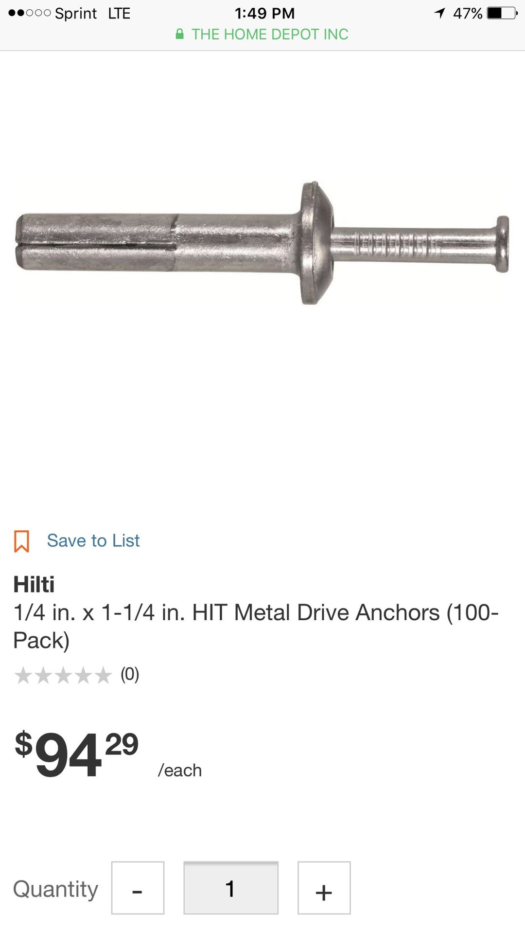 HIlti 66139 Metal Sleeve And Nail anchor HIT 1/4" x 1 1/4"