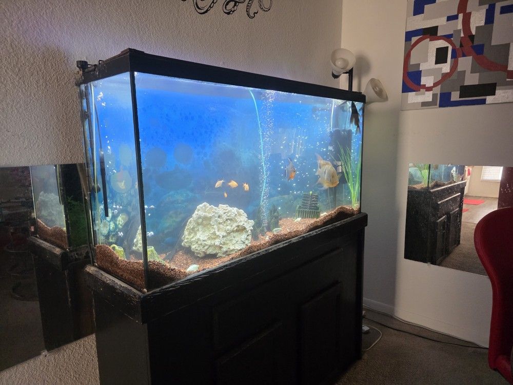 60 gallon tank + 2 high capacity filters + small internal filter + air pumps + LED lights + ornaments + sink attachment for water changes + all supplies (fish are optional)