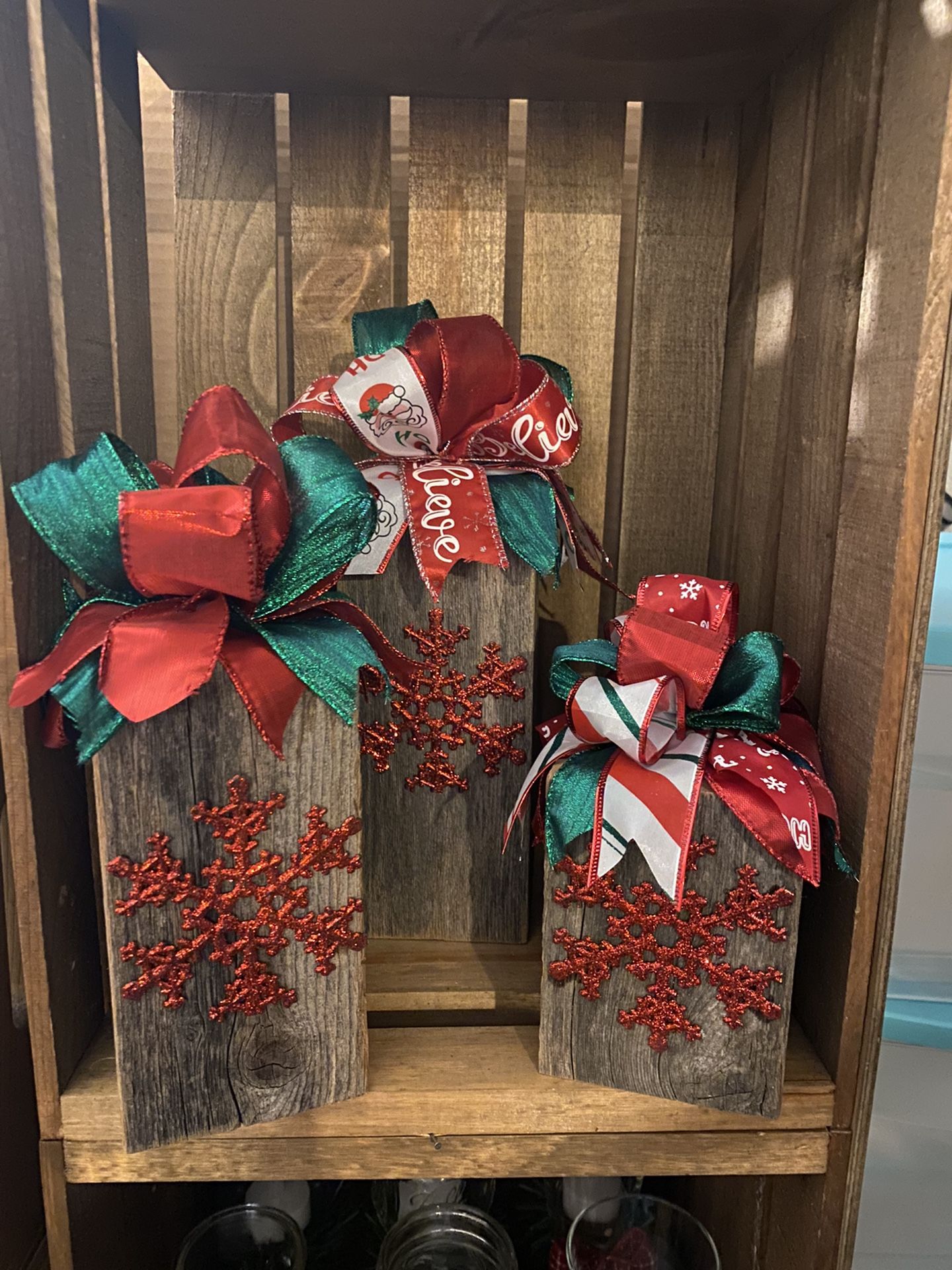 ~Hand crafted. Made from a 4x4 cedar post. ~Each set of 3 has a 5”, 7” & 9” post. ~Each post has a hand made loopy bow, a glitter star & a foam pad on the bottom so it will not scratch any surface it sits on. 💵Cash only💵 Cross posted. Meet at QT (5108 NE Vivion Rd) on Vivion Rd near N Brighton Ave. in the Northland near Claycomo.