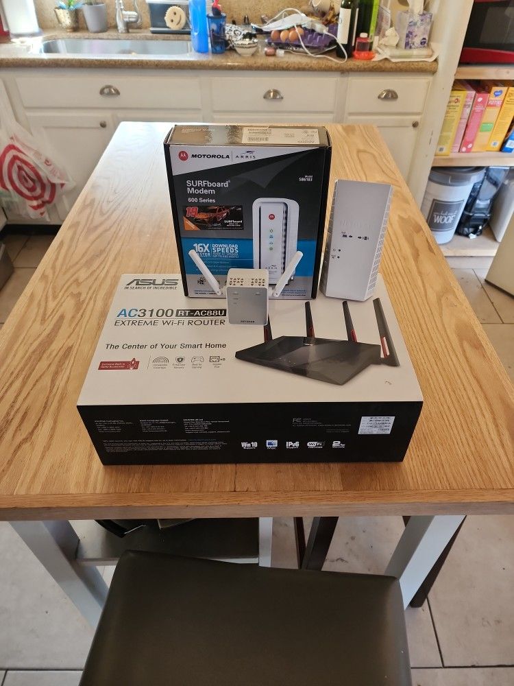 Everything below included Asus router Motorola SURFboard Modem 600 series SB6183 2 Netgear wifi extenders