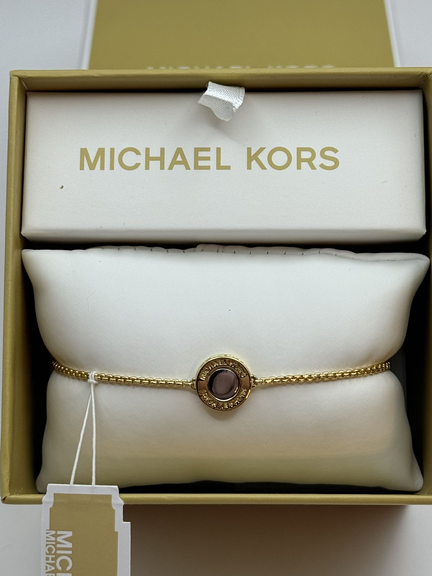 (HMTT) Add a touch of luxury to your outfit with this stunning Michael Kors Gold Tone Plated Brass MK Station Bracelet. This piece features a charming round closed disc circle with the iconic Micharel Kors logo, which is signed by the designer himself. The bracelet is made of high-quality metal and crystal materials, with a white/colorless main stone shape that adds elegance to any occasion. The bracelet is adjustable up to 8.5 inches, making it suitable for any wrist size. It is perfect for any fashion jewelry collection and can be worn for any occasion. This designer piece is a must-have for those who love Michael Kors and his unique style. Including the Original Box . MKJX(contact info removed)