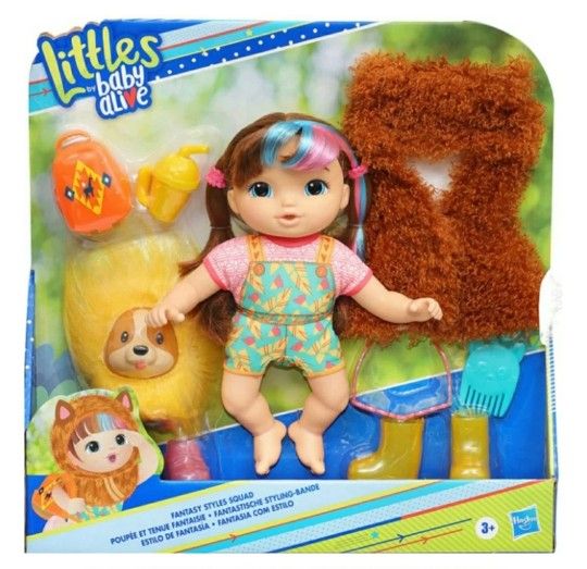 SAFARI-THEMED OUTFIT: Kids will adore Little Harlyn’s fun safari-ready clothes, including a fuzzy brown bear poncho and glittery hiking boots. (Additional dress-up styles sold separately.) PRETTY COLOR¬-STREAKED HAIR: This Littles Fantasy Styles Squad doll features an impossibly cute hairstyle with vibrant color streaks and also includes a comb for styling her rooted hair on-the-go! MIX-AND-MATCH ACCESSORIES: Little Harlyn comes with a comb, sunglasses, 2 pairs of shoes, poncho, bottle, backpack and pet Corgi with lion's mane costume. (Additional dress-up styles sold separately.) ON-THE-GO PLAY: With bouncy legs and arms that move and wiggle with tummy squeezes, the included 9-inch soft-bodied Littles by Baby Alive toddler doll is sized right for take-along play adventures