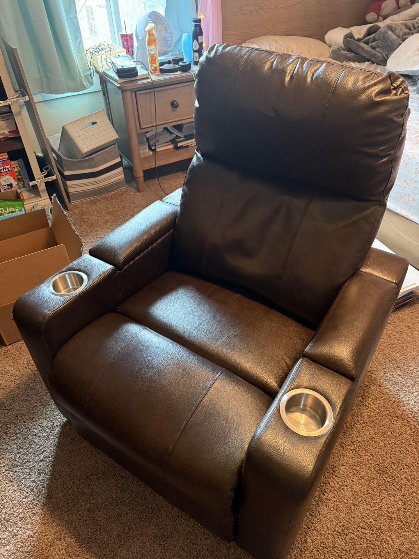 Mainstays Home Theater Recliner with USB Charging Ports and Brown Faux Leather. Both armrests have storage compartments to place items in. Recliner switch is broken and unable to recline.