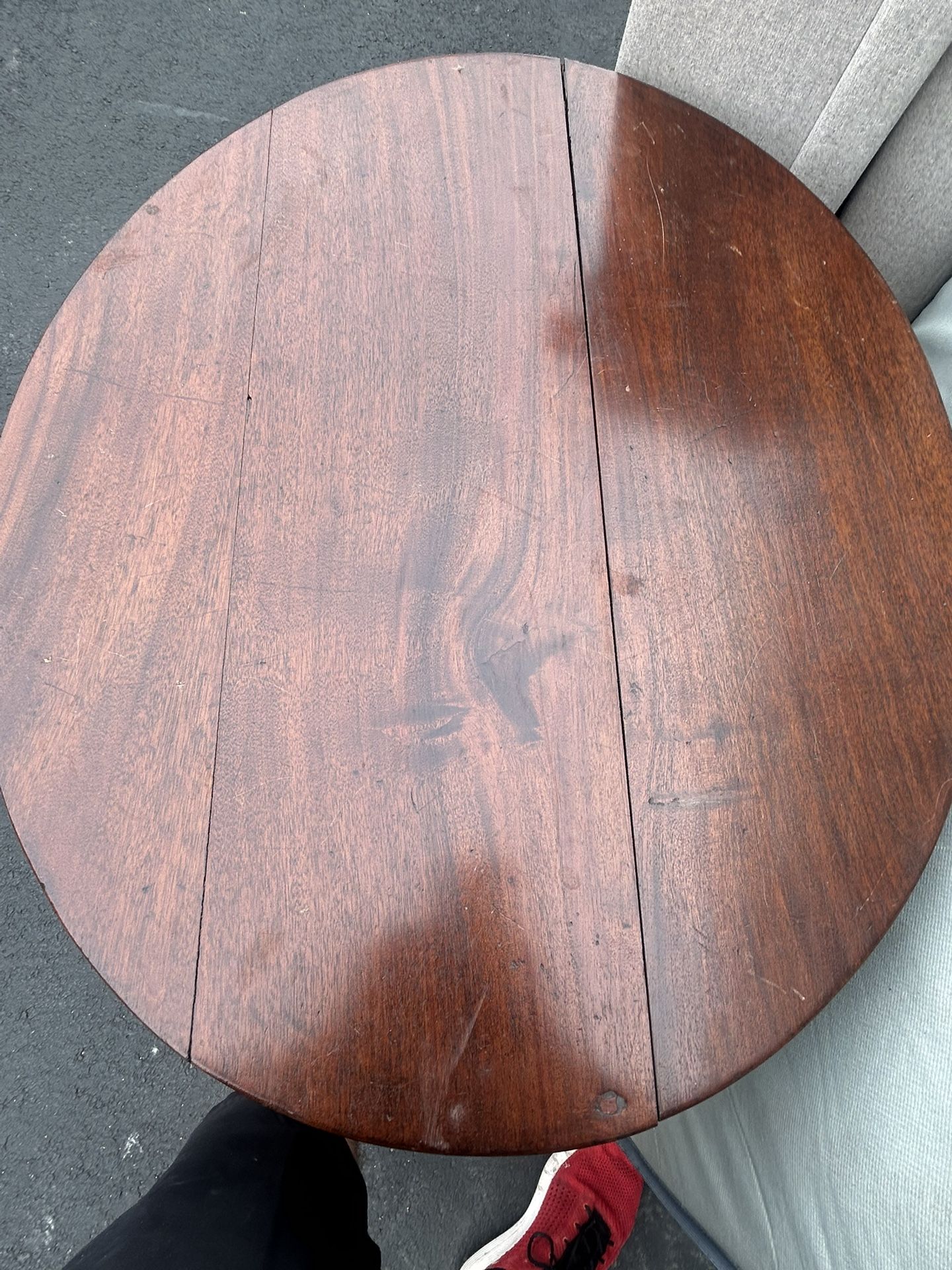 Beautiful solid wood round pedestal table with a classic 3-leg claw-style base. Sturdy, heavy, and well-built — not MDF or veneer. Perfect as a dining table for a small space, breakfast nook, or accent table. Details: • Solid wood construction • Round tabletop with pedestal base • Vintage / traditional style • Seats 3–4 comfortably • Rich wood tone Condition: Good used condition. Shows normal cosmetic wear consistent with age and use (light scratches and finish wear as shown), but structurally solid and very sturdy.