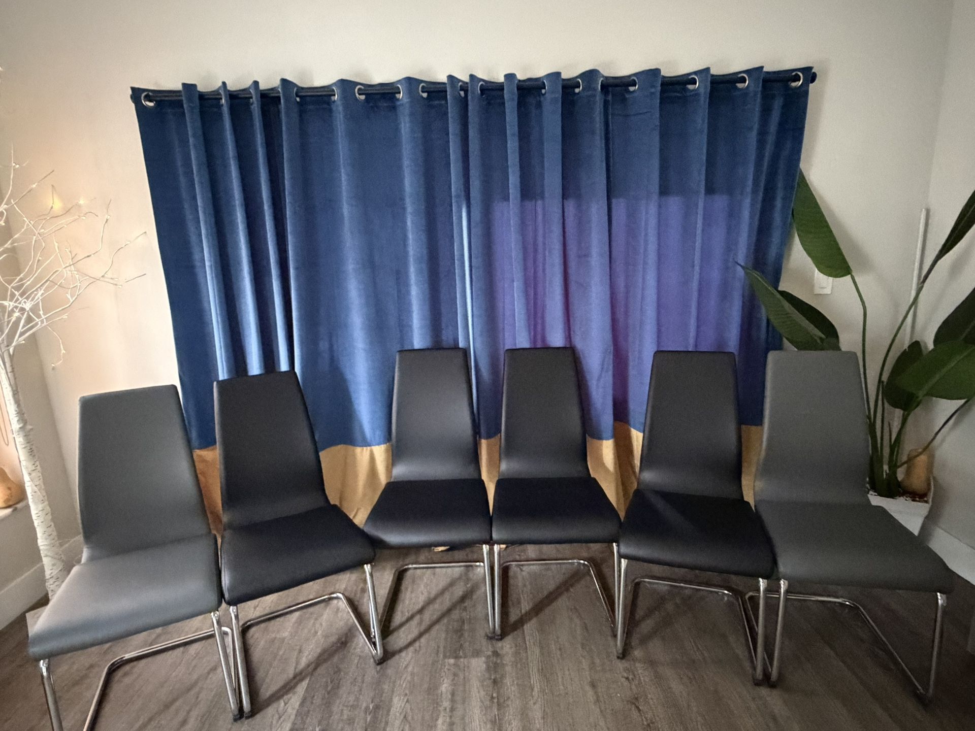 6 chairs for dining table. 2 grey for each end and 4 black 2 for each side.