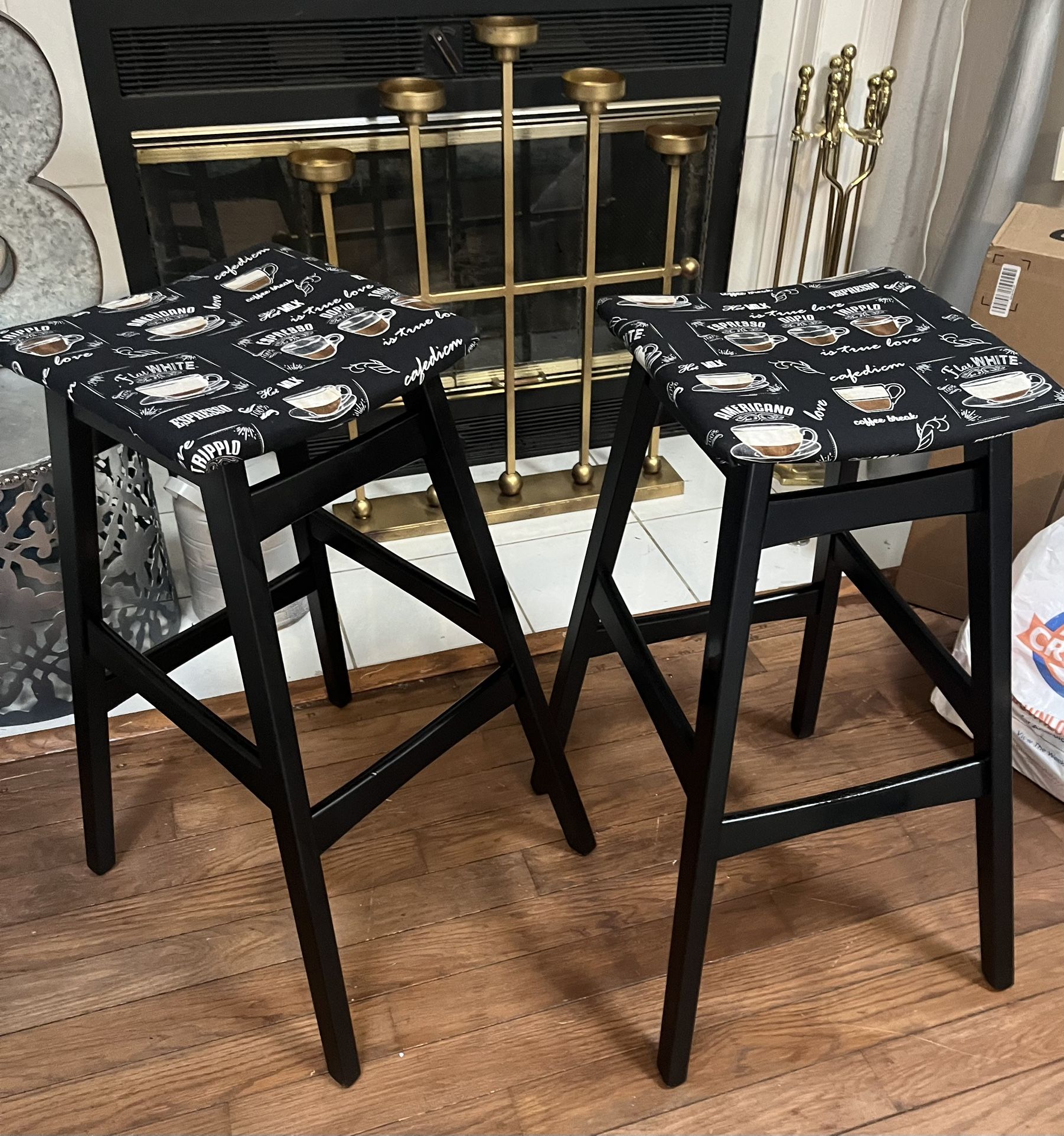 2 Black Wooden Bar Stools reupholstered seating, pet free smoke free home. $30 pair