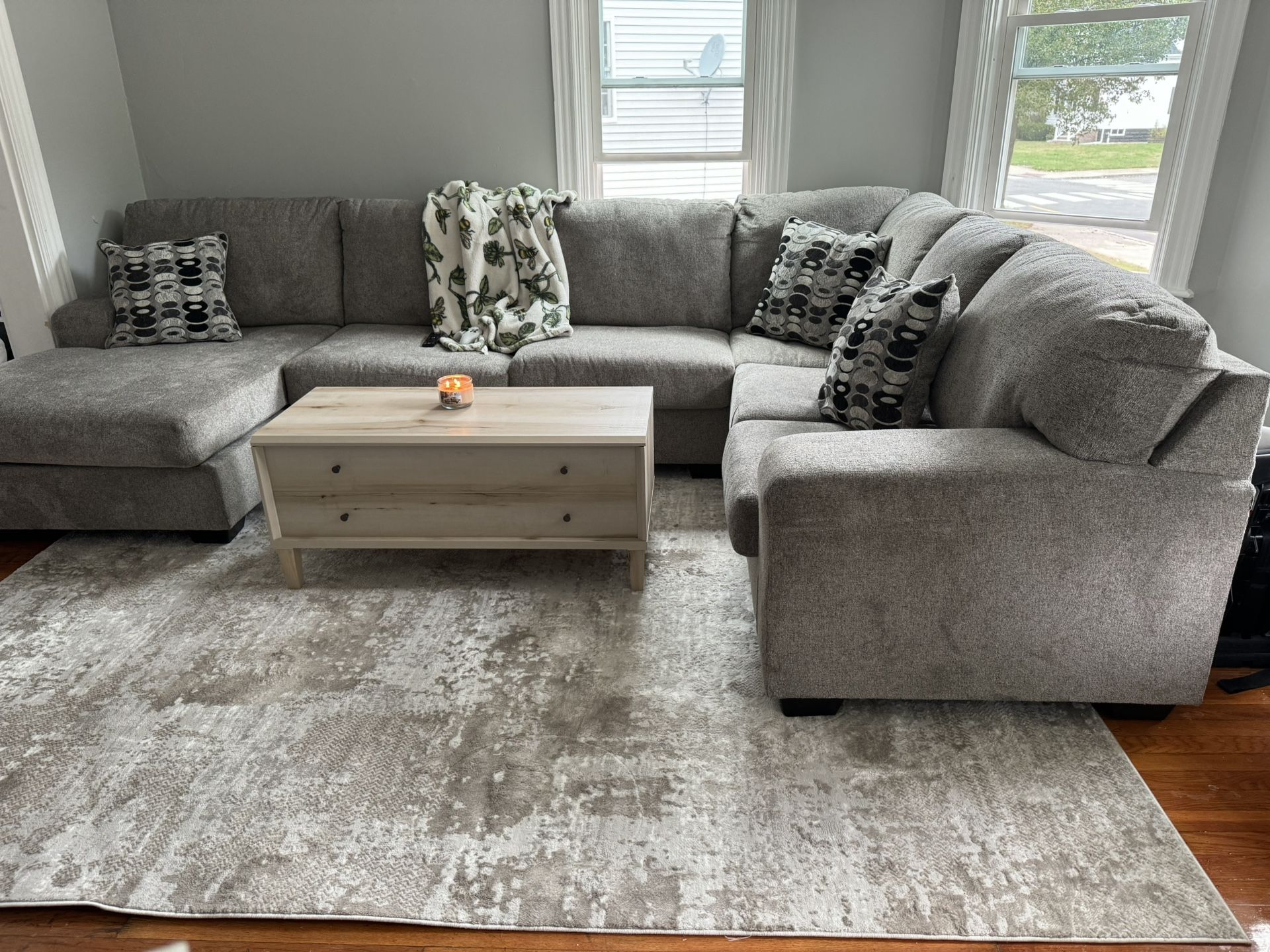 We bought this sofa a year ago and are moving into a much smaller place, there’s no way the couch will fit and we are sad to see it go! Hoping to sell it by August 14, as we are moving that following weekend. This is a pet friendly home but I will have the couch deep cleaned prior to the sale. The couch is in great condition and is a great size for hosting or for family movie night. Dimensions are: 141 inches at the longest point and 92 inches on the shorter side. The chaise section is about 60 inches long.