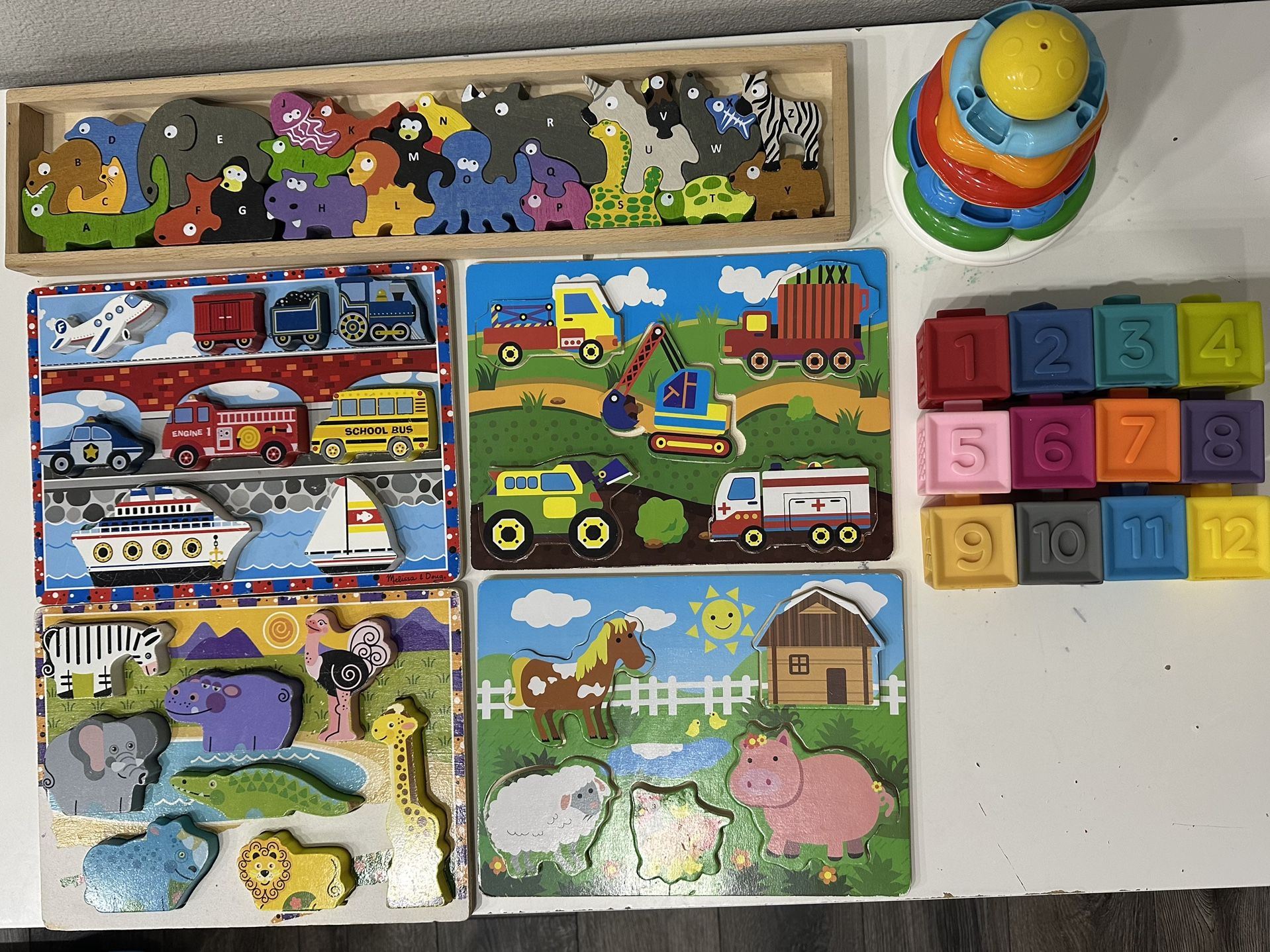 ABC puzzle, wooden puzzles . Leap frog phonics, motor skills hedgehog, fire truck and garbage truck