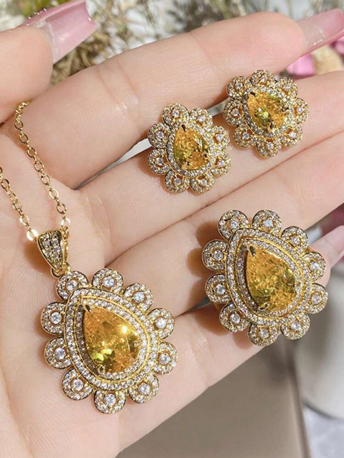 4pcs/set Gold-tone Yellow Gemstone Necklace, Earrings, Ring Suit For Wedding, Party & Costume