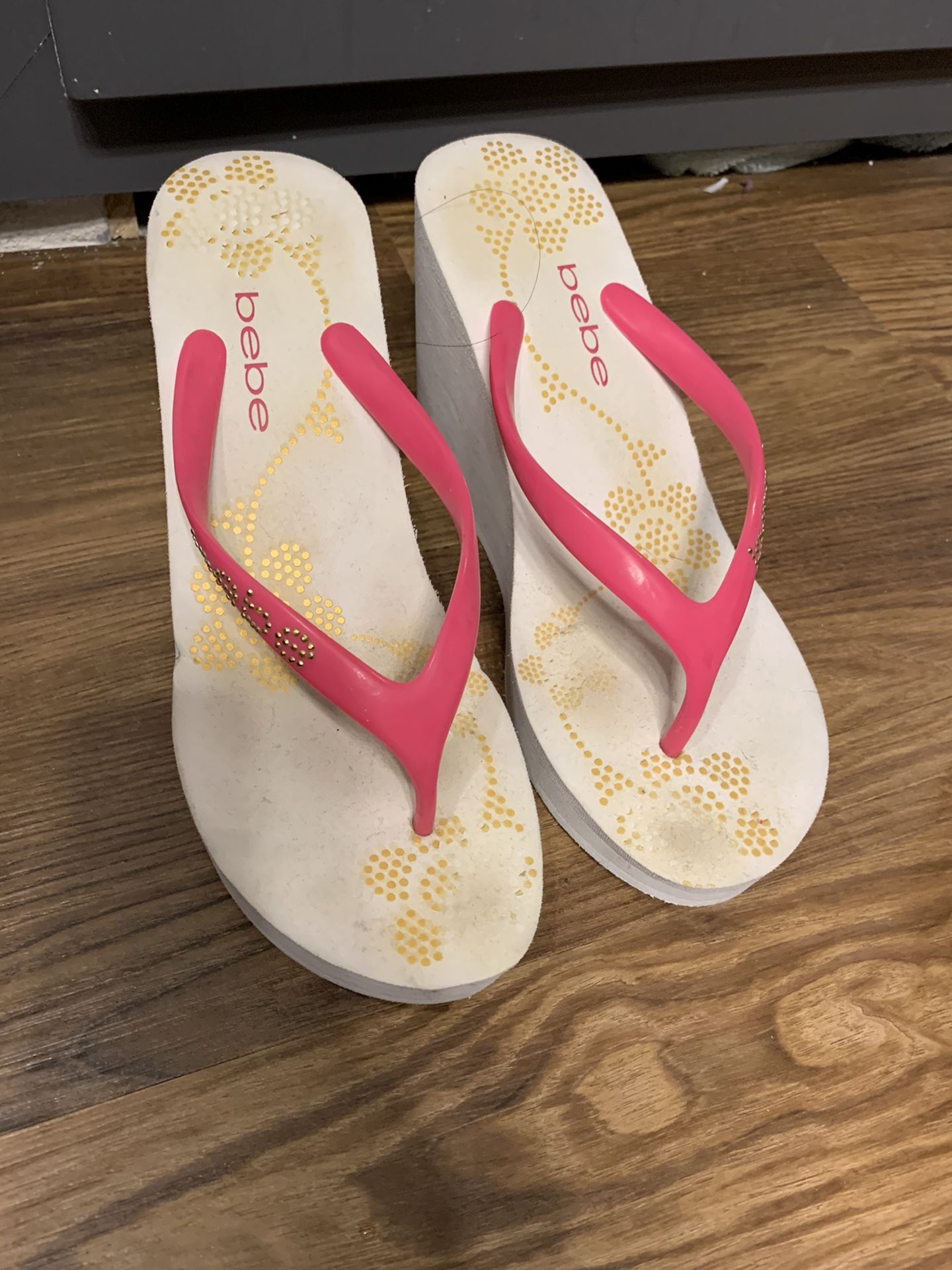Bebe flip flops heels -size 10 (large) white/pink