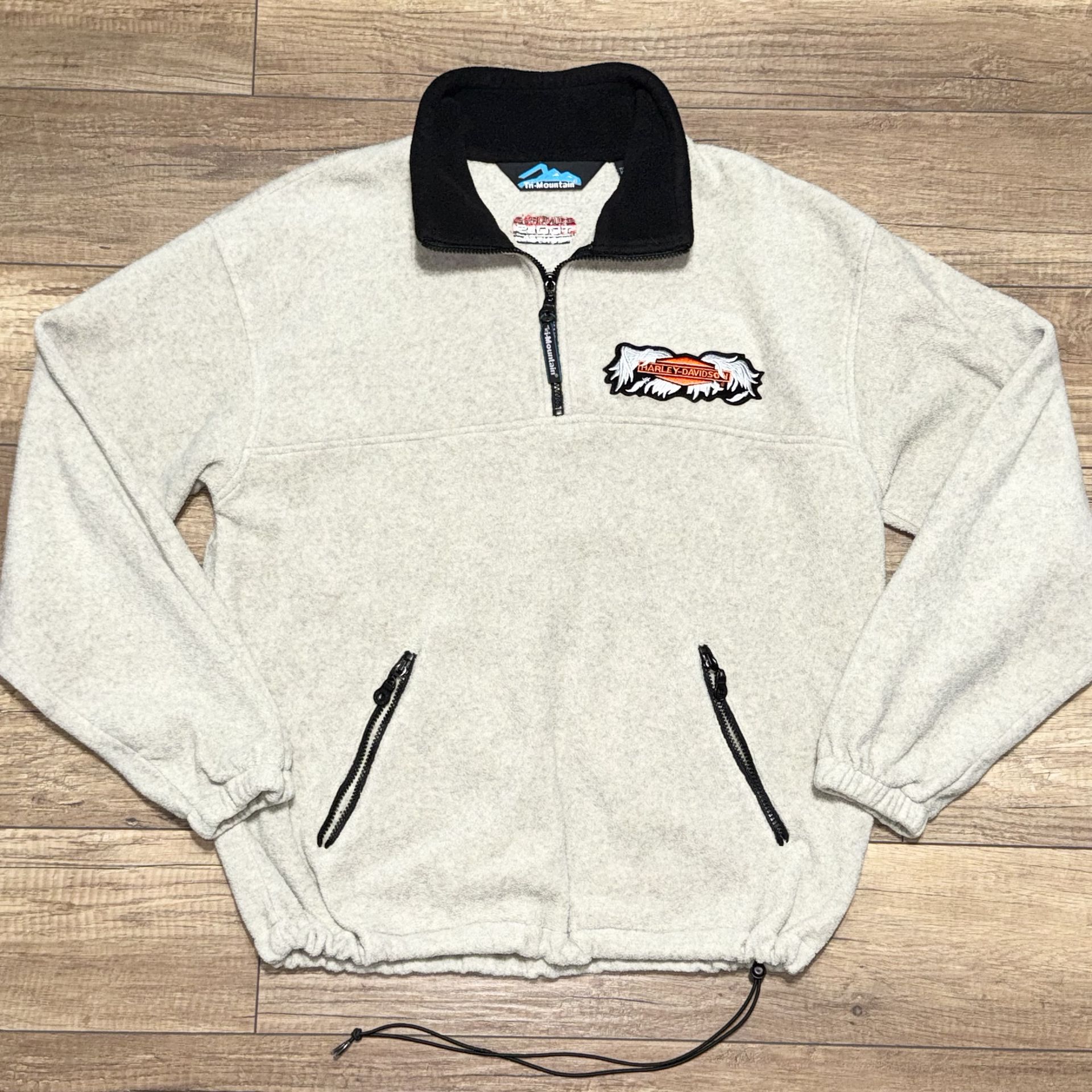 Lightly worn. Size Men's Large Oversized fit. Measurements: 24 pit to pit, 28 length. The Harley Davidson Tri Mountain Gray Fleece Quarter Zip Pullover Sweatshirt in size L is a vintage-inspired piece perfect for men who love the motorcycle, biker, and grunge styles. Made of a blend of polyester and rayon, this relaxed fit sweatshirt features a solid gray color with embroidered logo accents. The 1/4 zip closure and oversized design make it ideal for layering during the winter, fall, or spring seasons. With a retro and classic theme, this sweatshirt is versatile enough for various activities such as cycling, hiking, and weightlifting.