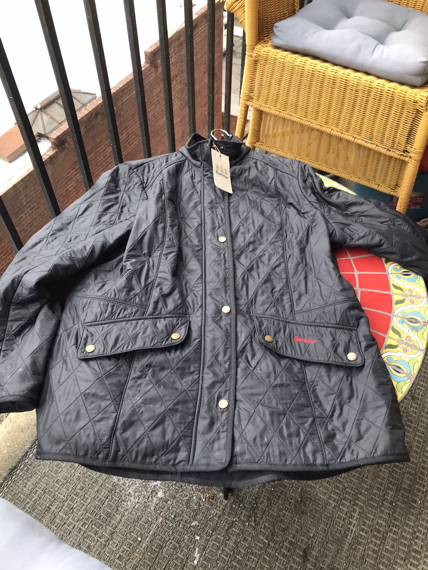 A women’s Barbour coat size 18 Navy blue with red logo on the pocket. Very stylish fit.