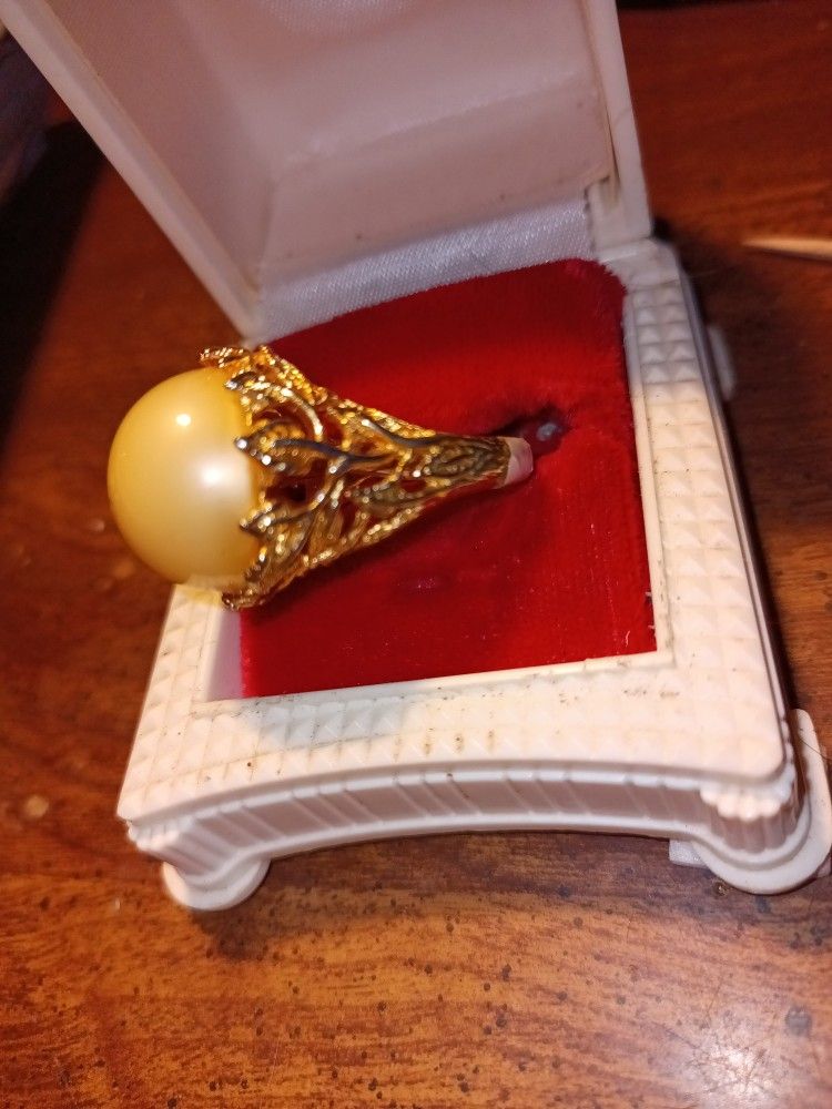 This Bold VNG South Ses Pearl Cocktail Ring is Stunning. It is set in a gold tone leaves and large flower setting with a solid band. It is a size 61/2. You can wear it with just about any outfit. It is a lovely piece to have in your wardrobe. Please refer to pictures for further details and description. Must be able to pick up in Lakewood. Feel free to check out my profile dashboard for other lovely VNG rings and items such as this. Thank you.
