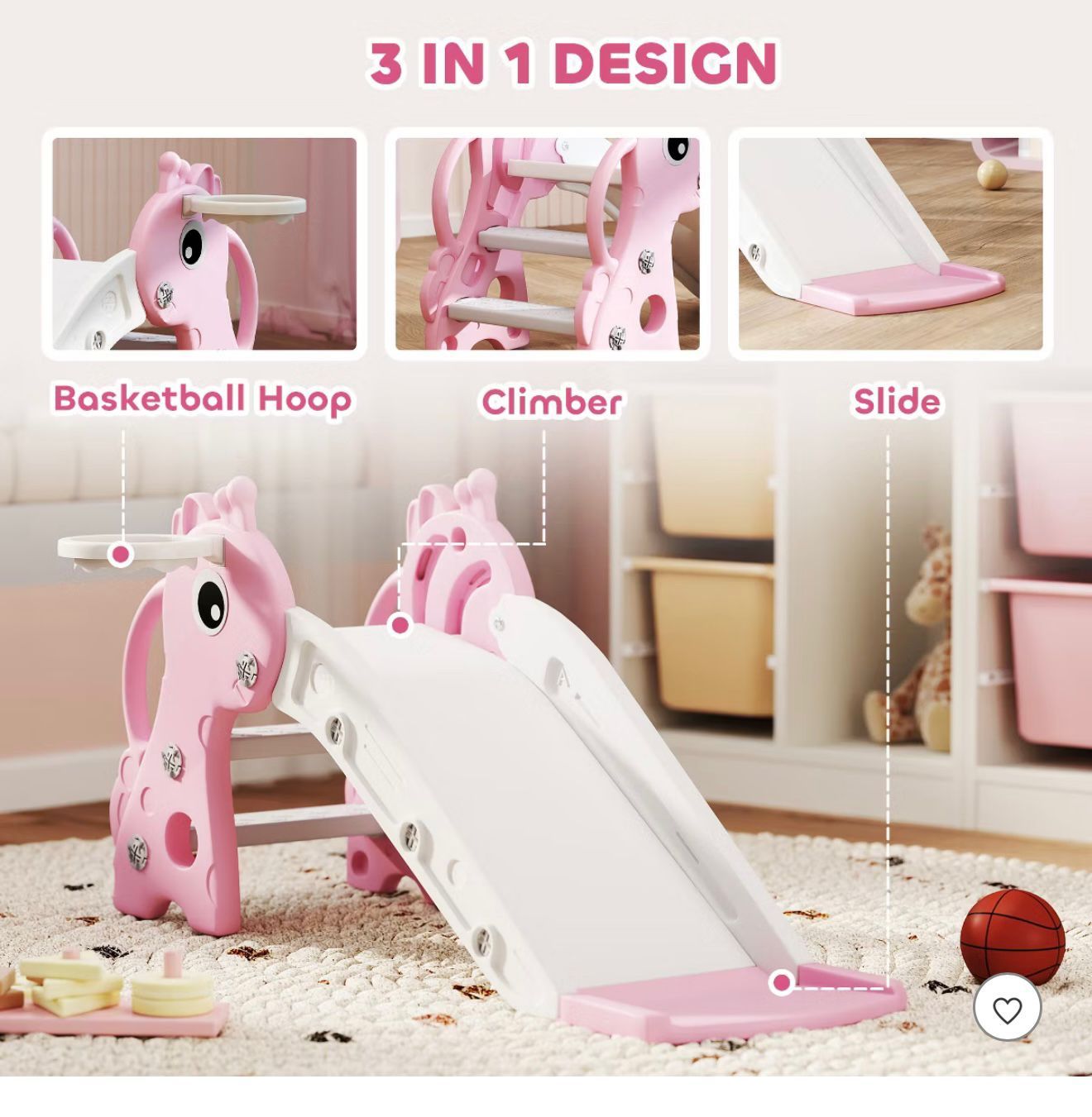 3-in-1 Toddler Slide for Age 1-3, Freestanding Kids Slide with Climber, Basketball Hoop and Ball, (Pink Gray)