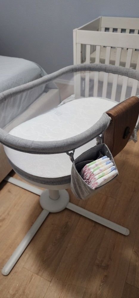 Still new Bassinet. Height Adjustable and bedside access. Everything works great. Comes with 2 extra covers and a extra padded mattress.