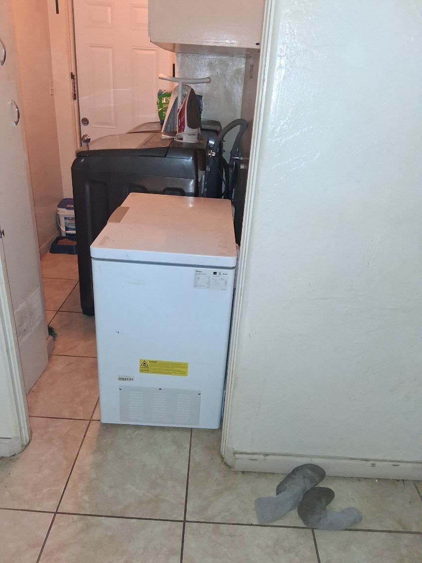 Washer -somethings wrong with it. Dryer works Great. Deep Freezer is less than a year. Bed set is Full size bottom, twin uptop. Microwave. All for $175