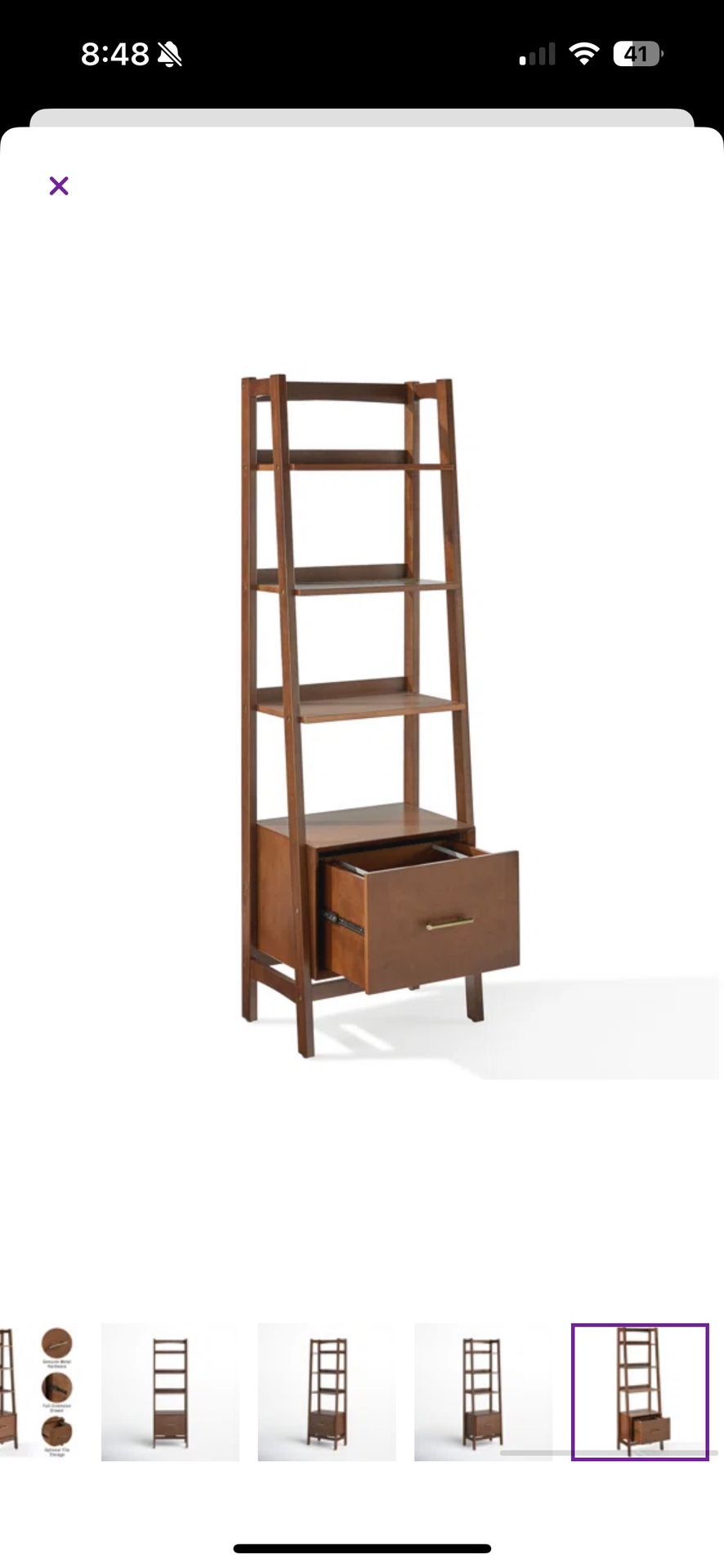 Selling a stylish ladder-style bookshelf with a warm walnut finish and clean modern lines, perfect for living room, office, or bedroom storage and display. The unit features four open shelves for books, decor, or plants plus a deep lower drawer with smooth metal glides and a sleek brass-tone pull for concealed storage. Compact footprint fits small spaces while the sturdy, tapering side rails keep everything stable and visually light. Details • Approx. 72–76” H x 22–26” W x 14–16” D (ladder profile with open shelves; see photos for proportions). • Solid/engineered wood construction in walnut stain; brass-tone hardware; full-extension drawer slides. • Condition: gently used, no wobble, shelves and drawer operate smoothly; minor, normal wear only. • Smoke-free, pet-free home; stored indoors and well cared for.