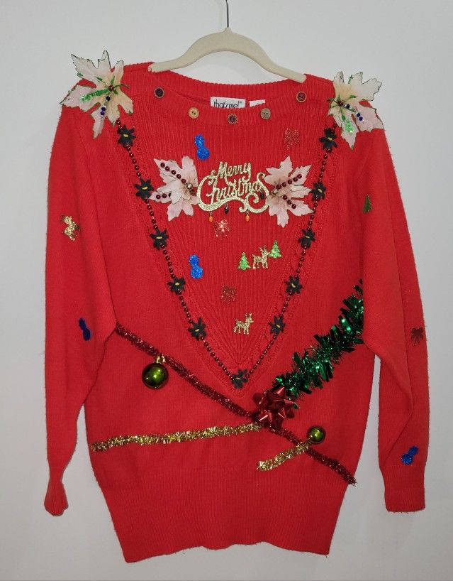 Ugly Christmas Sweater - Christmas decoration madness with this one-of-a-kind masterpiece. Freshly laundered, hand decorated by me! Get ready to walk into the room and be noticed. Show you care about the originality of the ugly sweater you wear this year! Size: Adult small, but runs on the larger side of small. Measurements: 19" pit to pit 28" length 28 & 1/2" neck to sleeve
