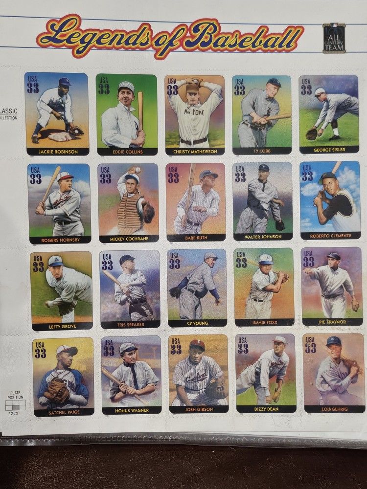 Legends of Baseball 33 cent stamps, 20 different stamps all in mint condition, there is Jackie Robinson, Babe Ruth, Satchel Paige, Lou Gehrig all twenty are different. This would make a great addition to any collection. Thanks for looking, take a look at my other items