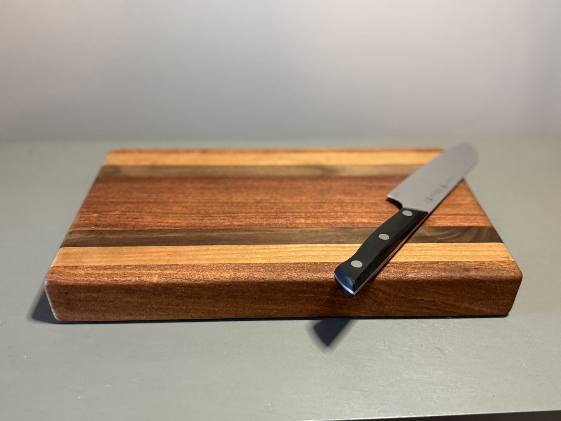 Dimensions: 12.5x7.25x1.5” This cutting board is made out of Mesquite, Walnut & Cherry *If you prefer it with a juice groove I can add one . We also make custom cutting boards with the design , wood & measurement of your choice . For more information feel free to send me a message!