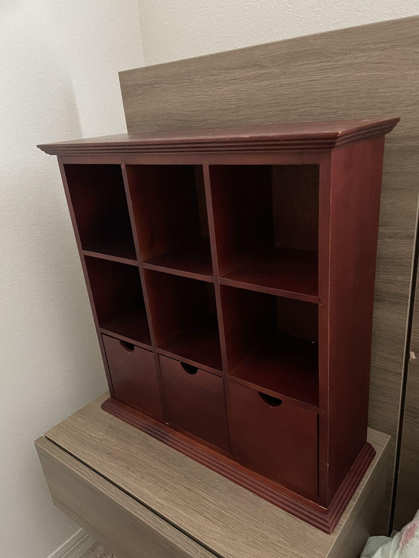 It’s got three drawers 9 cubbies in total I put tape and scissors for size reference in one of the photos Needs a wiping Pick up near Publix on gold hill rd and pleasant rd Near carowinds Cash or cash app