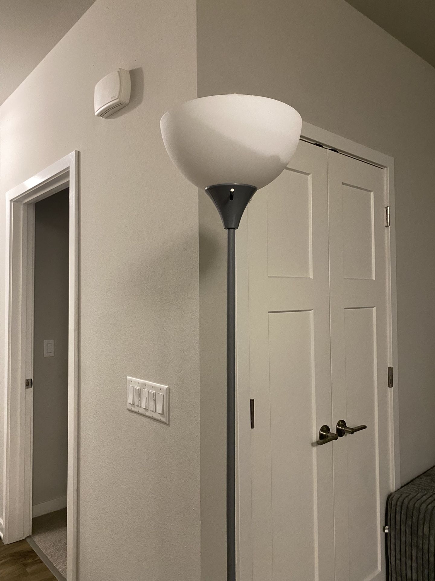 Grey/Silver Stand with white lamp shade Works normally, like new Comes with amber light bulb