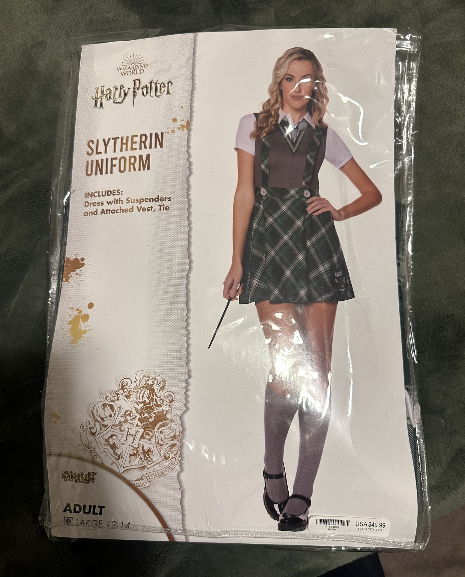 Hello I have this New In Bag Slytherin costume From Spirit Halloween Adult size Large (12-14) Comes from a smoke free home And free of pets Hablo español