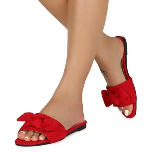 band, bow tie decor, lightly cushioned insole, and flat sole. MATERIAL: Faux Suede (man-made) MEASUREMENT (tested sz 6; approx.): Heel Height: 0.45" (approx) Color: Red CLOSURE: easy slide FIT: True to size