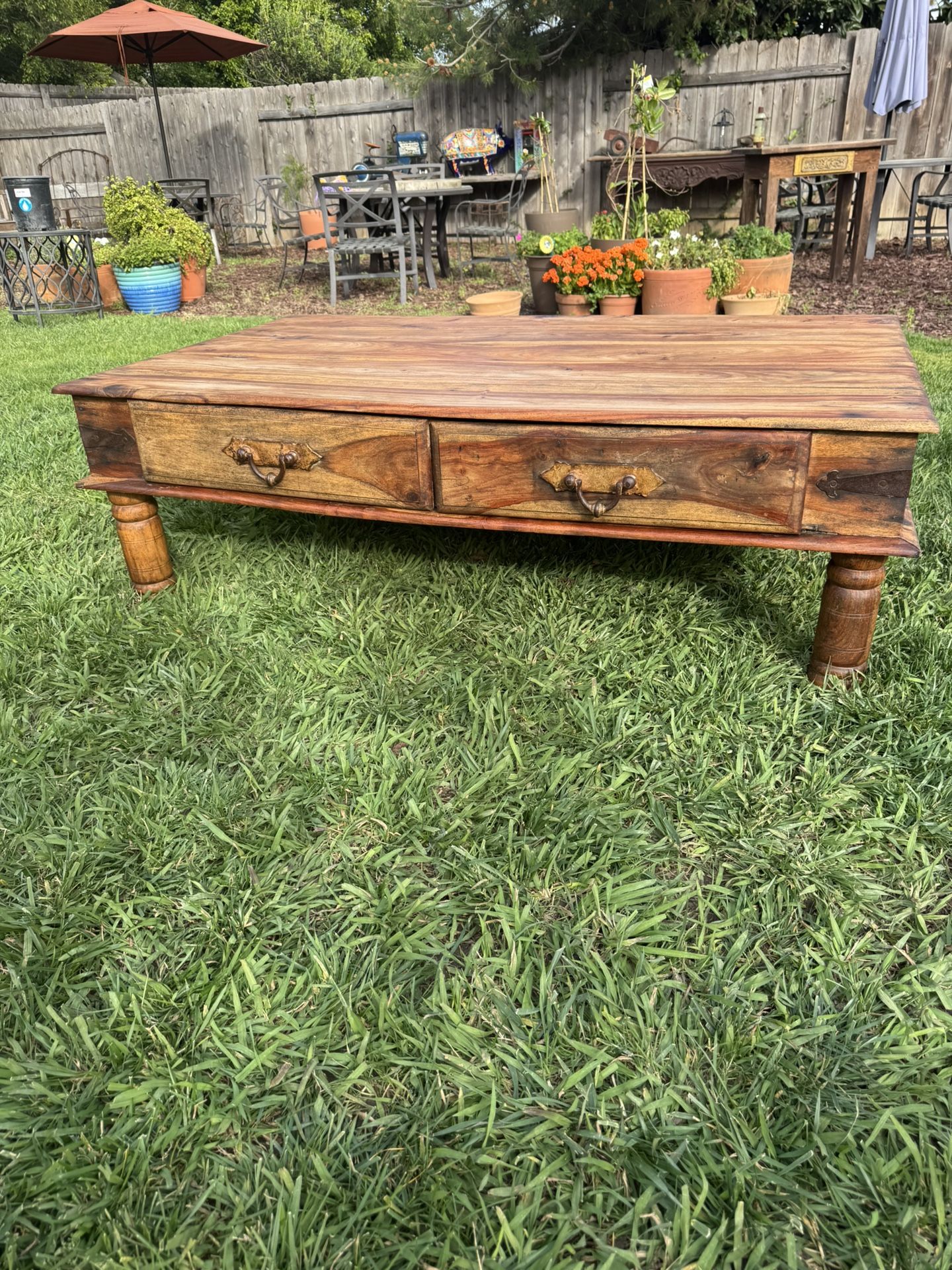 Solid teak large rustic coffee table featuring 2 drawers for storage. Approx 4 by 5 ft. Will deliver for free within 15 min radius of La Costa.
