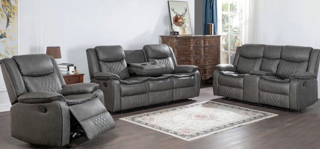****AMAZING SAVINGS**** Brand New 3 Piece Motion Living Room Set Only: $1999 Was: $2499 Set Includes: Sofa, Loveseat & Chair Grey Palomino Fabric Sofa Drop down Table Loveseat Console Glider Recliner Perfect for kicking back Hablamos Español Our Locations Are Open & We Still Offer Delivery or Pick Up Order From The Comfort & Safety of Your Home Or Come Check Out Our Showrooms! Message Us To Order Today! INCREASE YOUR PURCHASING POWER!!! Easy Approval Credit Check Program w/ 6, 12, 18 & 24 Months Financing No Credit Needed Also Available. 90 Day Purchase Option $49 Come See Us @ One Of Our 2 Locations: Zoe’S Furniture in Richardson, TX. or Dallas, TX. ONLY!!! HH CS