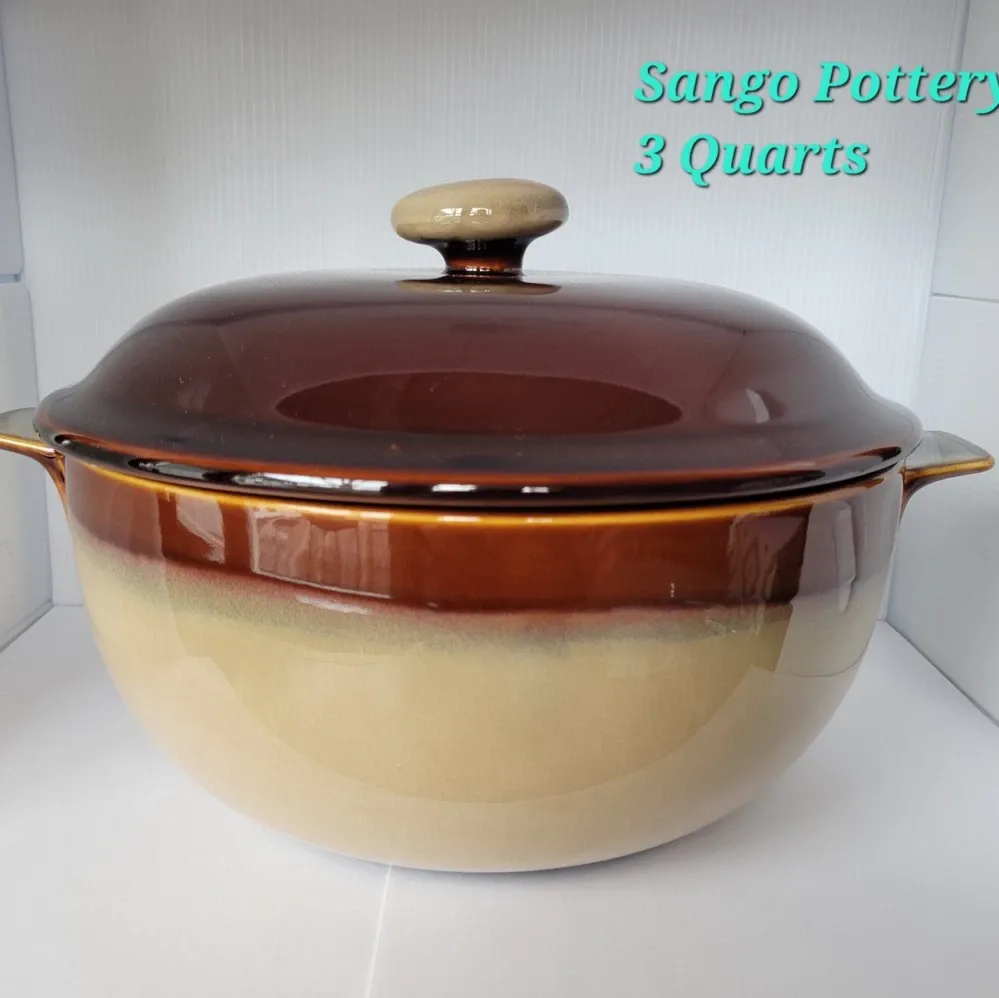 Sango Nova Brown 3 Quart Covered Casserole 📌 Descripción Cazuela redonda de cerámica/stoneware Color degradado café oscuro arriba y beige abajo (estilo muy 70s–80s) Con tapa original y asas laterales Capacidad aproximada: 3 quarts (2.8 litros) Apta para horno, microondas y lavavajillas Marca vintage (muchas ya están descontinuadas) Es ideal para: Hornear lasañas pequeñas, arroz, guisos, frijoles Servir directo a la mesa porque conserva muy bien el calor