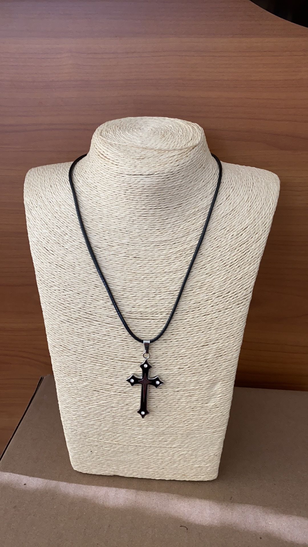 Men's stainless steel cross necklace with white zircon inlaid in the center of the cross. With an adjustable leather cord, the length is 22 inches it