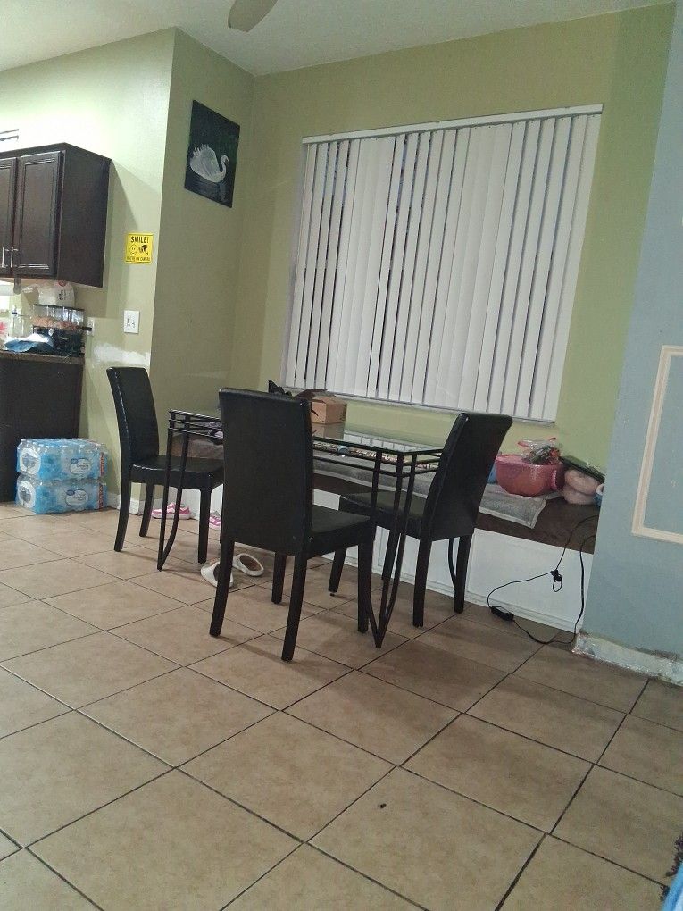 Glass top dining room table with 4 chairs. 1 chair is still in the box .