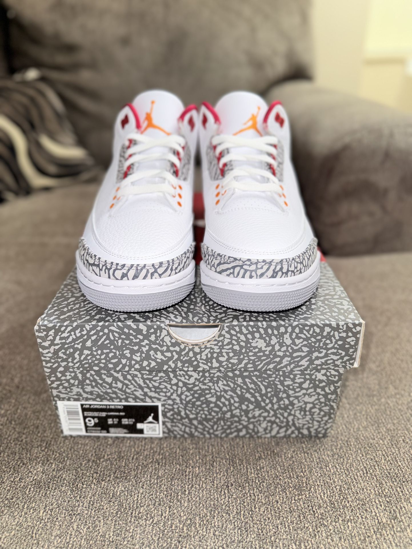 Constructed with white tumbled leather and signature Elephant Print overlays, the Air Jordan 3 Cardinal Red takes a traditional approach in its color blocking and fabrication, similar to the iconic Black Cement 3s. Spicing up the design, sharp Cardinal Red midsoles and detailing pop against the neutral toned upper. Bright orange Jumpman logo embroidery on the tongue adds the finishing touch.