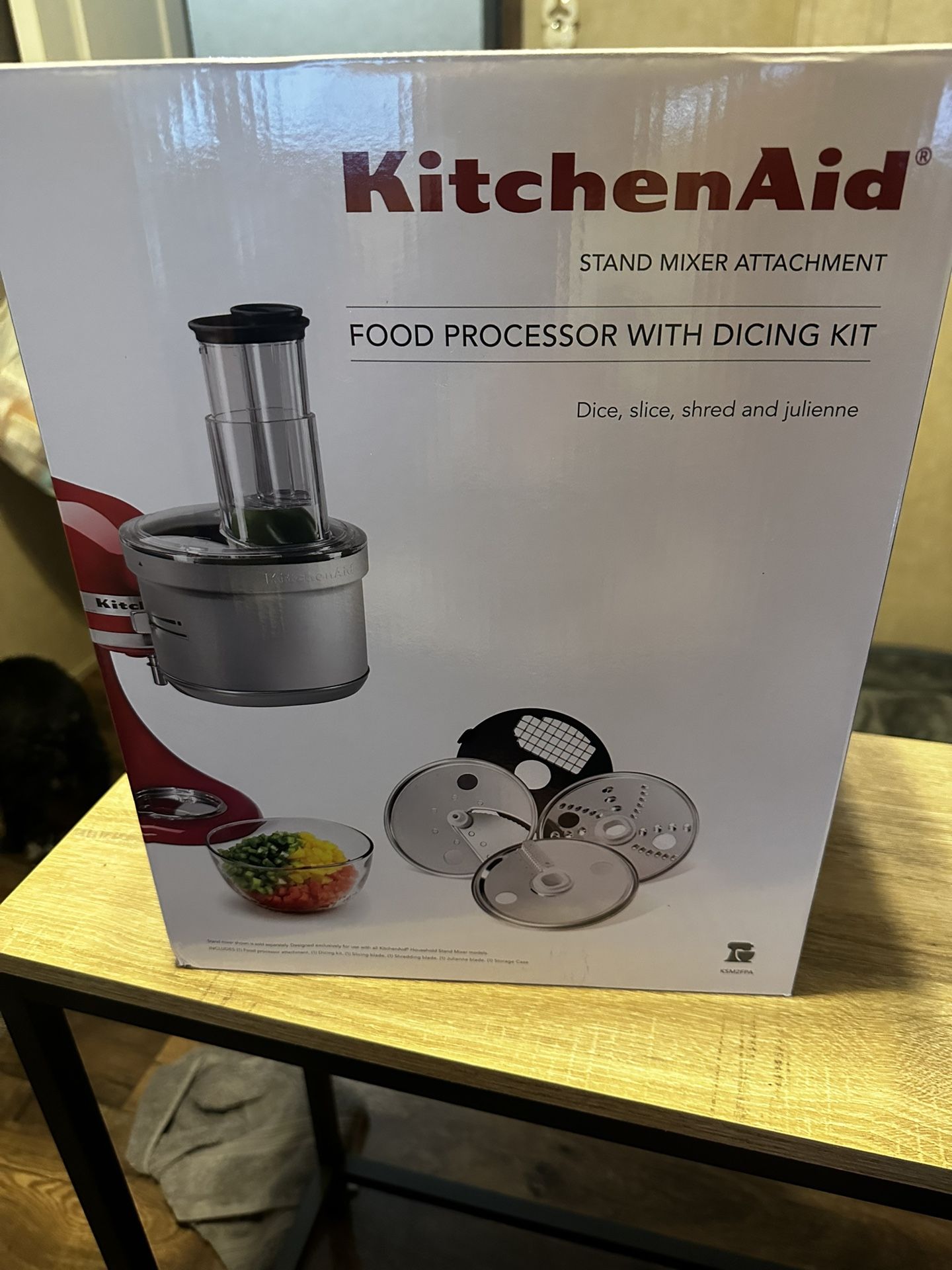 BRAND NEW NEVER USED IN BOX! 200.00 ON AMAZON KitchenAid KSM2FPA Details Use this KitchenAid KSM2FPA food processor attachment to increase the versatility of your KitchenAid stand mixer! Designed to attach to the power hub of your stand mixer, this food processor attachment eliminates the need for a separate appliance to help save on valuable kitchen space. It comes with 4 different blades, allowing you to slice, shred, julienne, and dice a variety of ingredients with ease. Plus, its 2-in-1 continuous feed tube enables you to add food items of varying sizes and shapes to the bowl during operation, while the food pusher helps guide ingredients down into the blade. Featuring KitchenAid's ExactSlice System, this attachment allows you to create thin or thick slices by simply sliding its manually adjustable lever to the left or right to achieve your desired thickness. Additionally, it works in conjunction with your mixer's speed settings to provide you with greater control during processing, ensuring your unit will properly slice anything from soft bananas to hard cheeses with the touch of a button. When cleaning this attachment, the assembly body should be hand washed with a warm, damp cloth, while all other components can be placed in the dishwasher. Plus, the included dicing disc cleaner can be used to further ensure thorough cleaning of your dicing disc and blade. For your convenience, a case is included for secure storage. Blade Set Includes: -(1) reversible shredding disc -(1) adjustable slicing disc -(1) julienne disc -(1) dicing kit -(1) disc adapter