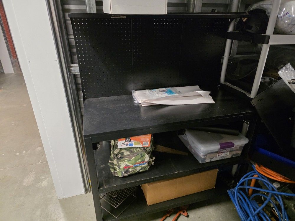 This is a black metal work bench with 2 additional shelves below for more storage. It has locking wheels so it can be moved around as needed. 59 inches tall 49 inches wide 24 inches deep