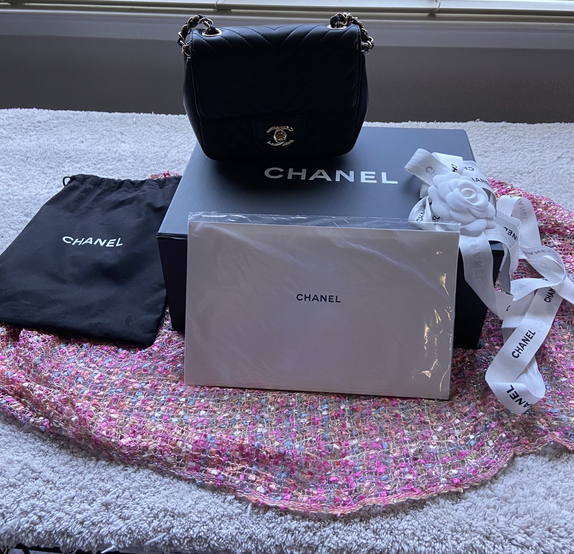 Chanel Classic square Mini flap bag in Chevron black leather Base length 6.5 inch Height 5.25 inch Width 3 inch Drop 19 inch GG gold logo Chain strap Pocket on back Made in Italy This is an authentic mini square flap bag. Certificate of authenticity included This bag has a waist length gold chain leather threaded shoulder strap and gold Chanel CC turn lock Only use a few times. In excellent condition