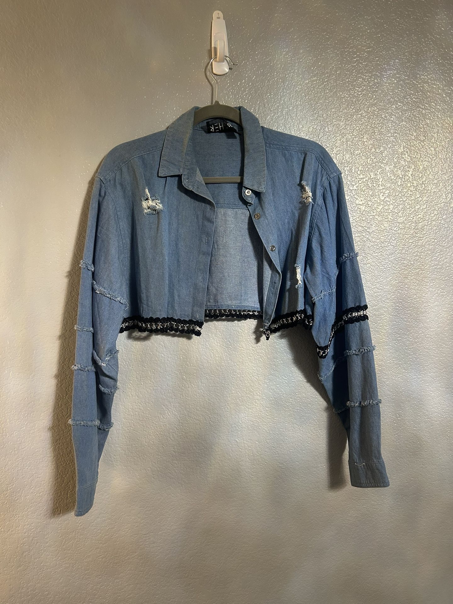 Women’s blue denim chain ripped cropped jacket size small