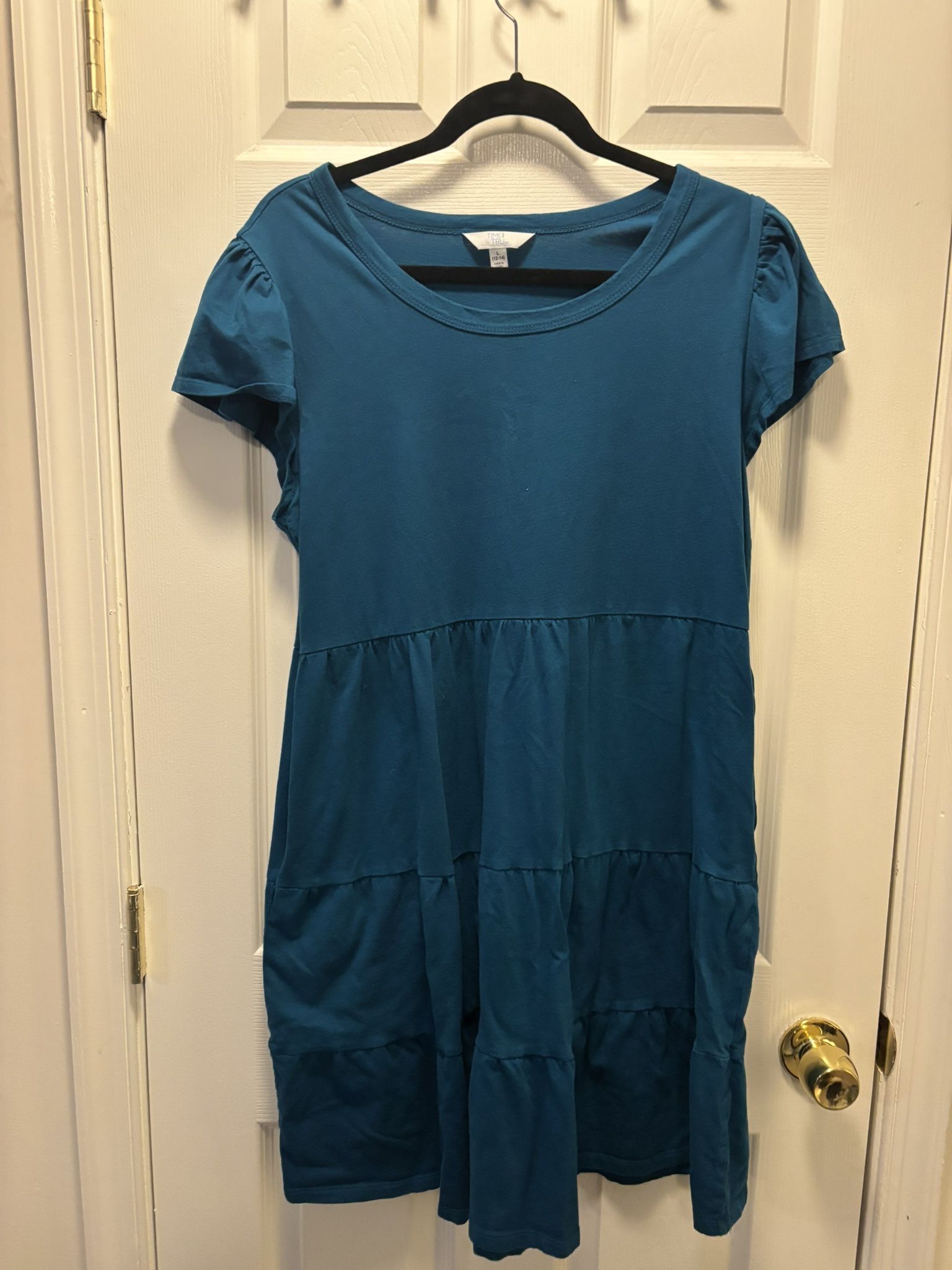 Chic turquoise dress with short sleeves. Ideal for everyday wear. Dress has pockets.