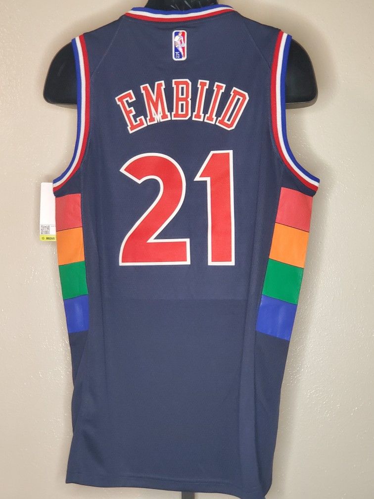 Nike Pro NBA game jersey. Brooklyn Nets, #21 Joel Embiid, navy blue w/ red numbers & letters, trimmed in white. Multi-colors, along the sides, 75 yr. patch. Size: large, brand new, never been worn!