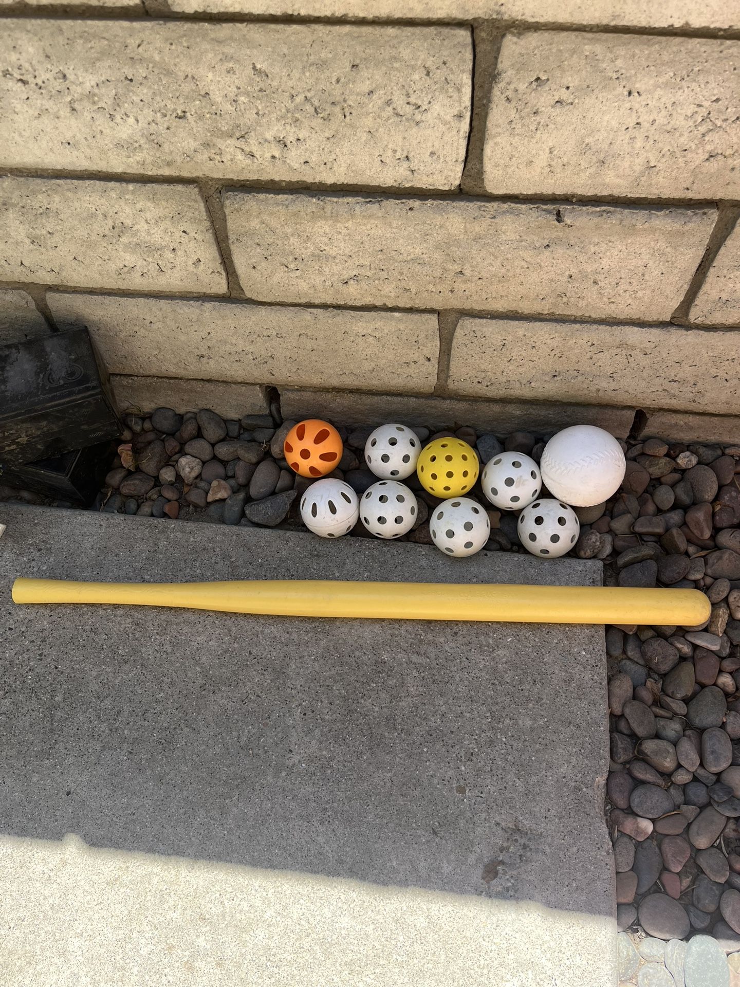 8 wiffleballs 1 official wiffleball bat (cracked) 1 softball sized plastic ball $5 for all