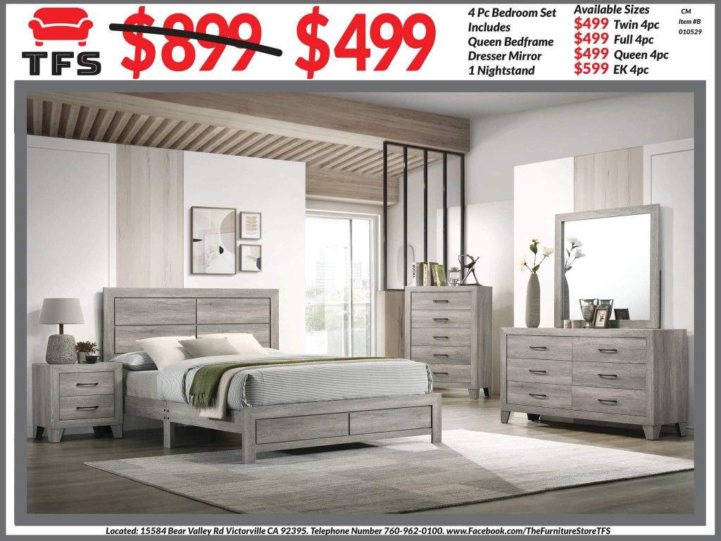 NEW YEARS SPECIAL 4pc Bedroom Set Twin $499 4pc Includes Bedframe (No Boxspring Required) Dresser mirror nightstand Rustic Light Grey Full $499 4pc Includes Bedframe (No Boxspring Required) Dresser mirror nightstand Rustic Light Grey Bedroom Set Queen $499 4pc Includes Bedframe (No Boxspring Required) Dresser mirror nightstand Rustic Light Grey Bedroom Set Eastern King $599 4pc Includes Bedframe (No Boxspring Required) Dresser mirror nightstand Rustic Light Grey Bedroom Set VISIT US TODAY THE FURNITURE STORE 15584 BEAR VALLEY RD VICTORVILLE CA 92395 OPEN 7 DAYS A WEEK 10AM-6PM FINANCING AVAILABLE NO CREDIT NEEDED 90 DAYS OR 100 DAYS 0% INTEREST DELIVERY AVAILABLE IF NEEDED RESTRICTIONS APPLY: Prices are Subjected To Change Without Notice