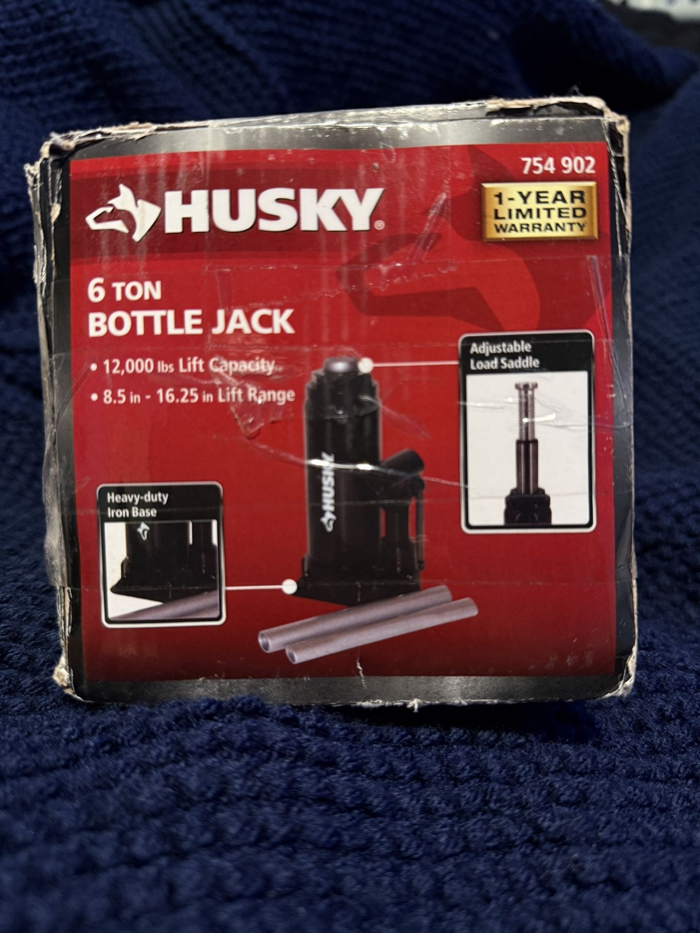 This is a Husky 6-ton Hydraulic Bottle Car Jack, it is a new item the box it slightly dented