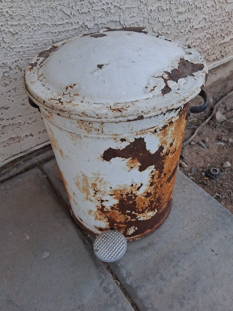 White Rustic farm yard trash can, with foot opener that works. Great show piece